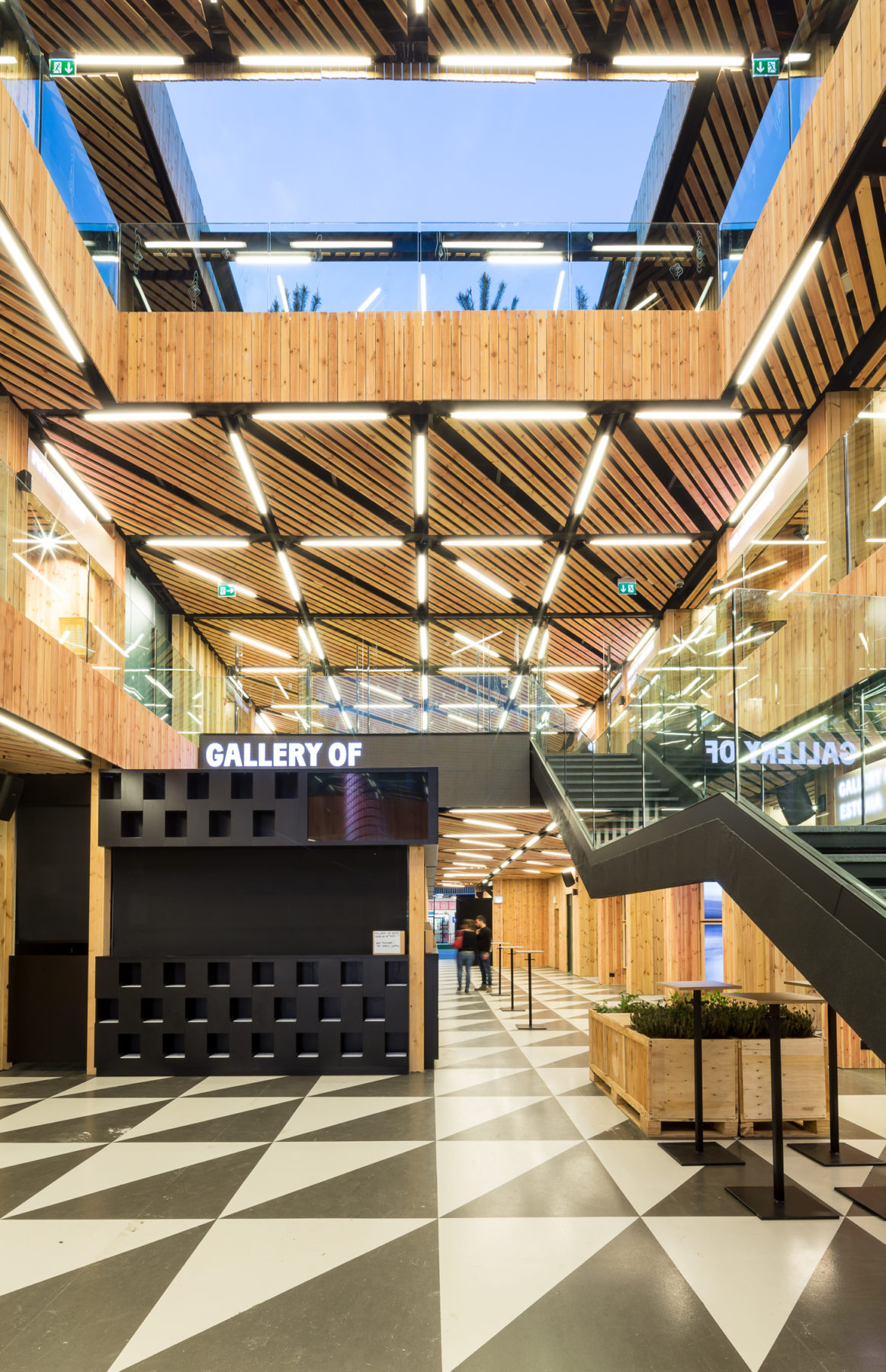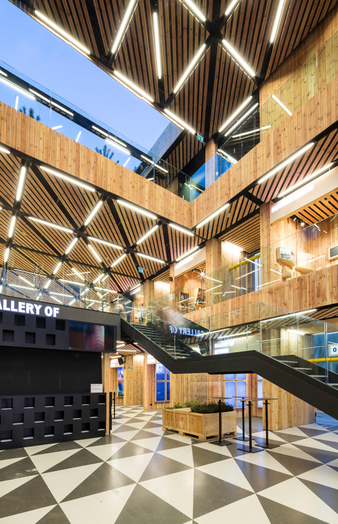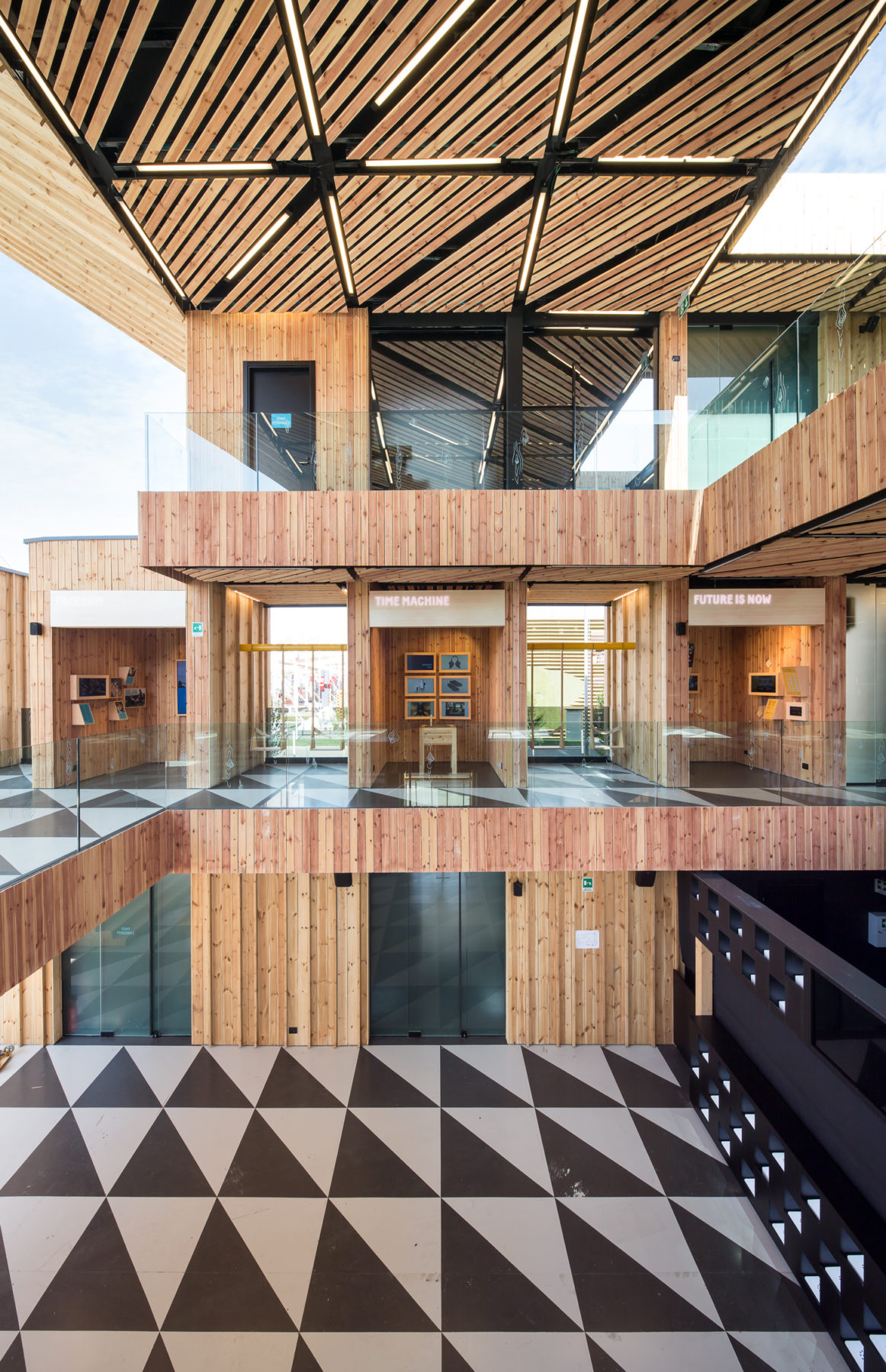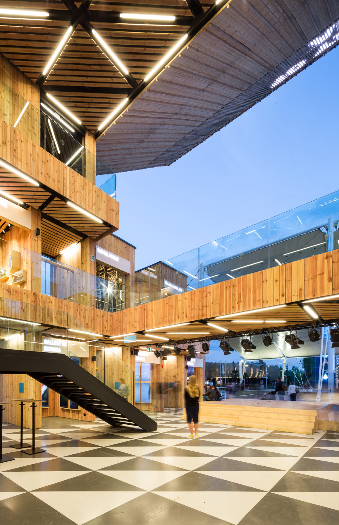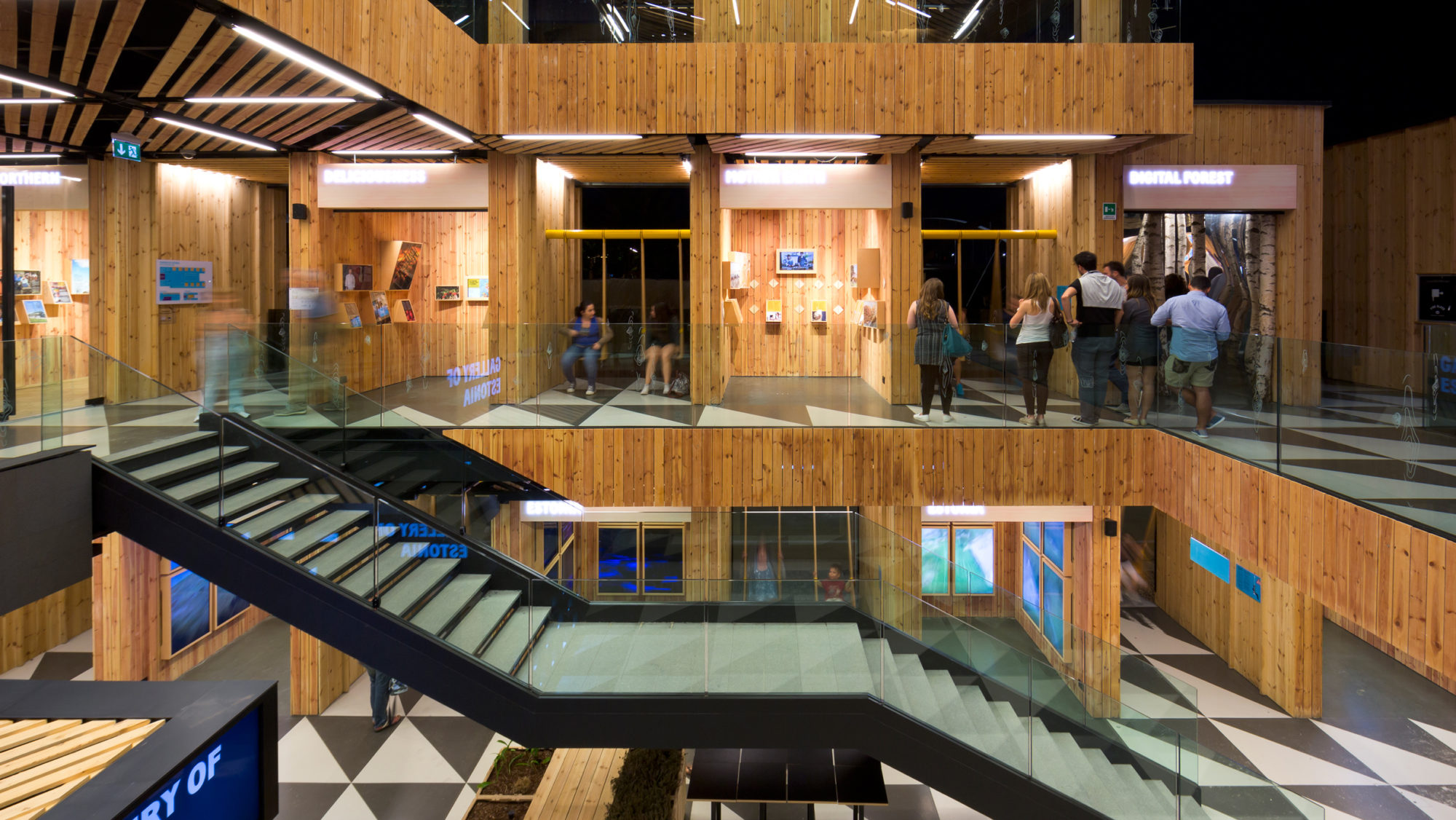 The interior consists of “boxes” that all had a specific theme such as Estonian food or nature etc. Additionally, the room featured temporary furniture to enhance the display of short-term exhibitions. Flexible lightning, modular shelves and movable screens assisted in the design of multi purpose room. The linear nature of the architectural solution was disrupted with explosions of geometrical shapes on the ceiling, walls and floors. One of the most memorable features were rays that connected showpieces throughout the pavilion. The specially designed rays emphasised the importance of sustainable lifestyle. The ecological footprint of the temporary complex was a leading principle in the whole design process. Now the building has been reused. The virtual replica of the pavilion that was already existent before the construction has created a lifespan of its own on design and architecture websites.
